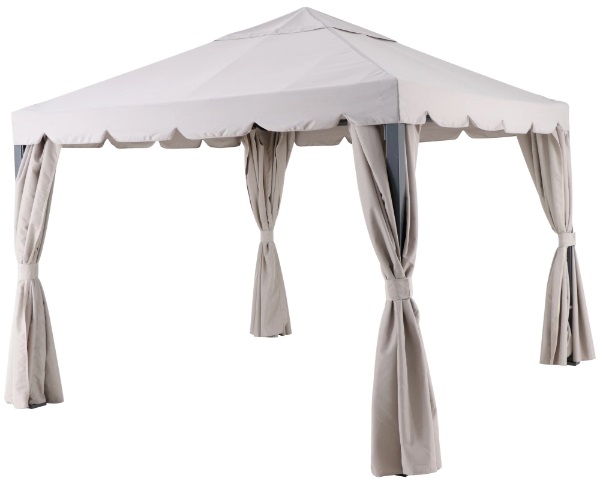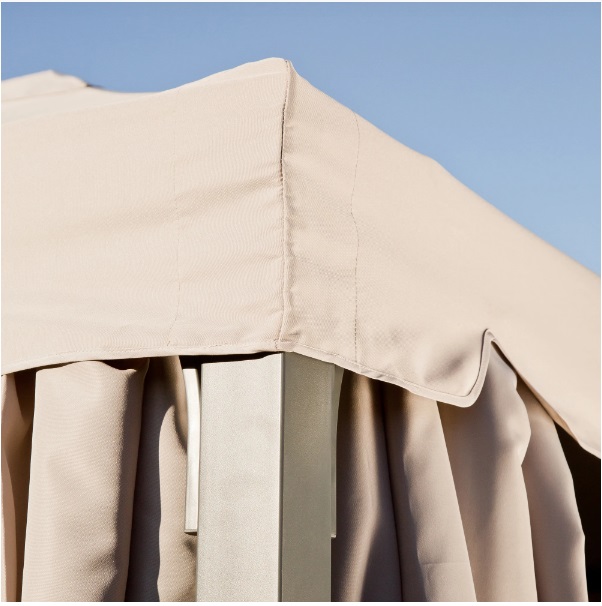 Размеры павильона в смонтированном виде — 299 × 282 × 299 см. Покрытие шатра — полиэстер, ткань имеет УФ-защиту. Набор прост в сборке и эксплуатации, по окончании летнего сезона легко разбирается.