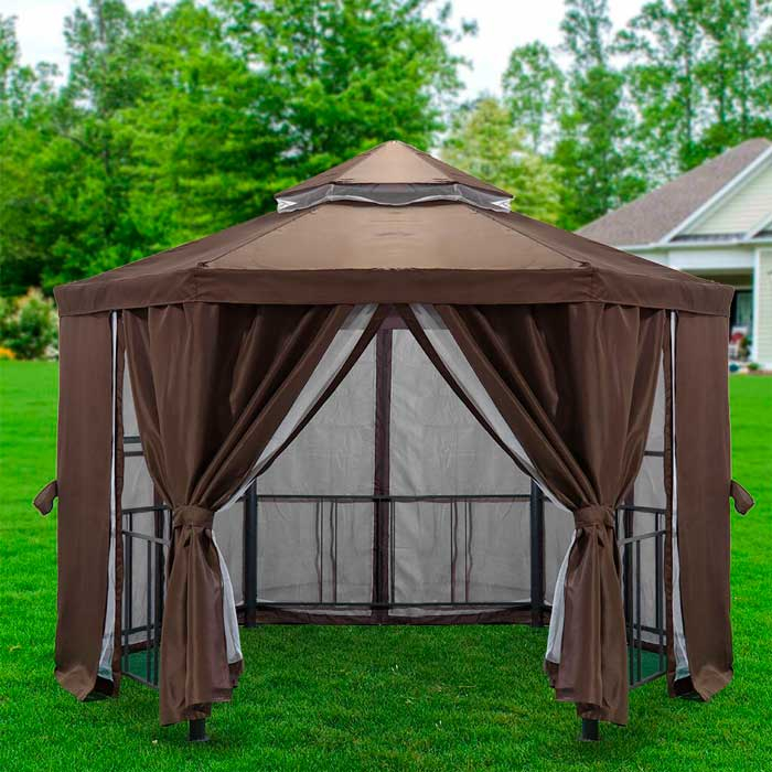 Хотим предложить вам приобрести такое изделие, как комплект для шестиугольного шатра. Данный комплект выполнен в коричневом цвете. В нём находится крыша-тент с клапаном для проветривания, плотные шторы, а также москитная сетка, которая защищает от насекомых. Это наилучший вариант в том случае, если вы хотите сделать свой отдых более комфортным. Комплект защитит вас от солнечных лучей, ветра, дождя, насекомых. Подойдёт комплект для размеров шатра 1,75 х 1,75 х 2,75 м. Крыша изготовлена из полиэстера с плотностью 160 г, а боковые стенки из полиэстера плотностью 140 г с сеткой.